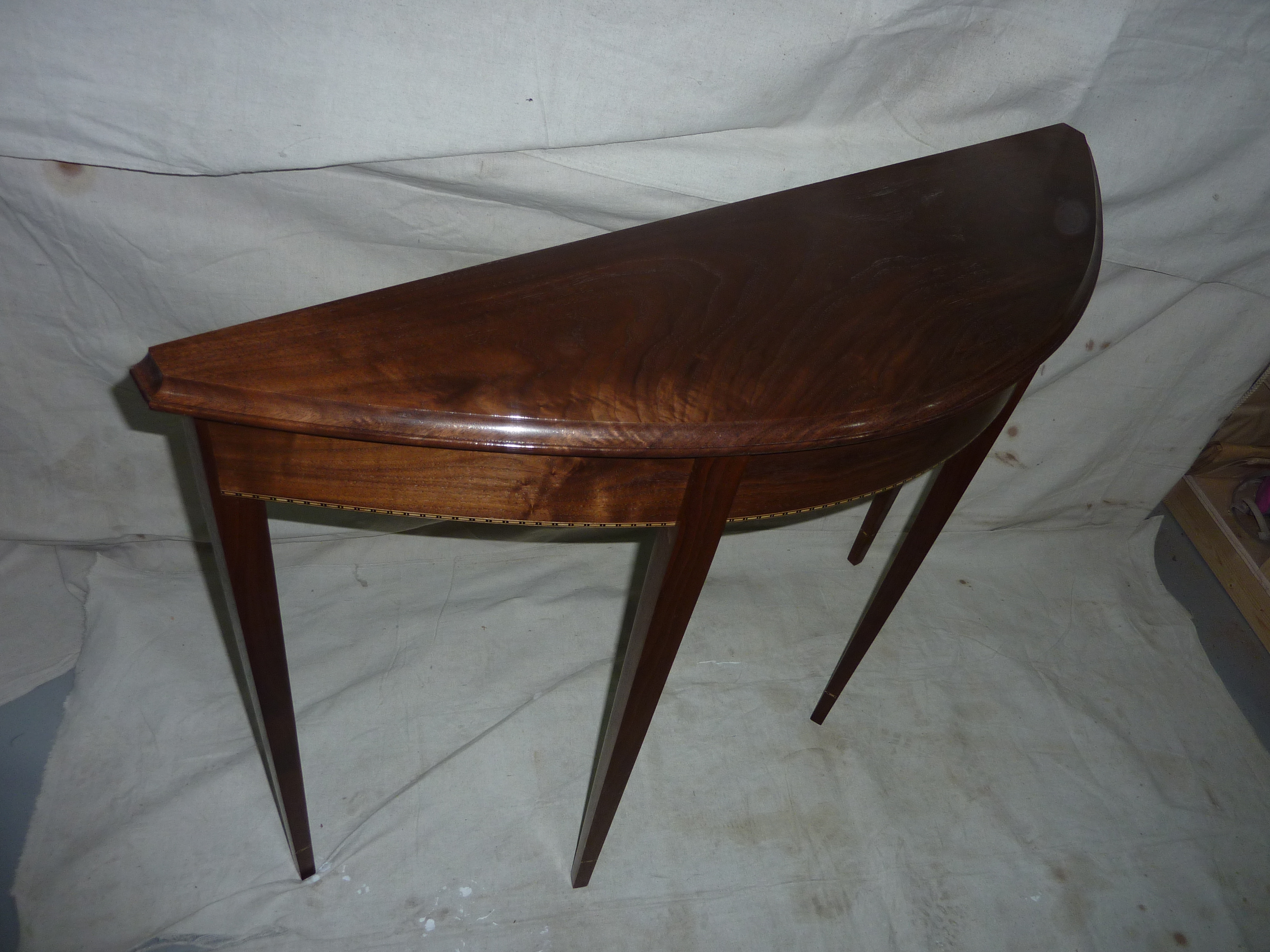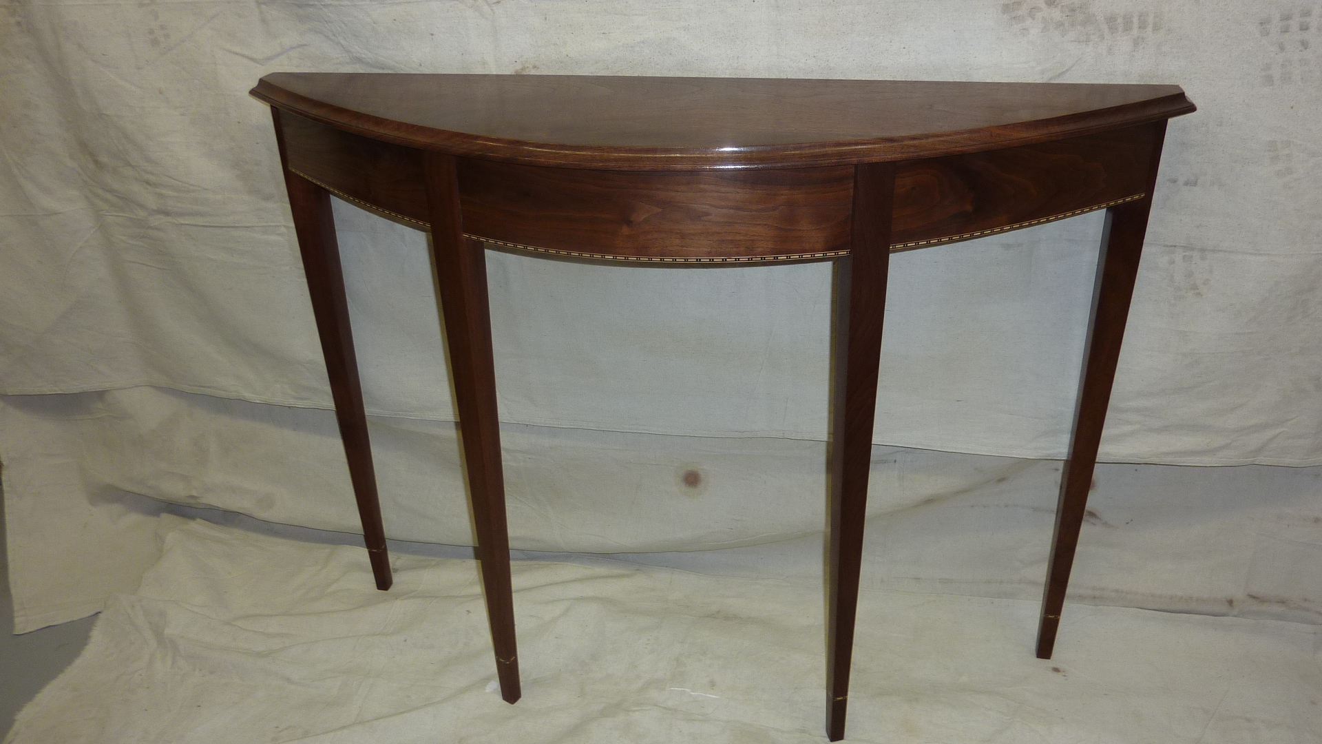 I recently finished this hall table, or better known as a demilune table for my sister. It is solid walnut with inlays on the lower apron and legs. Curve front is done with bent lamination.