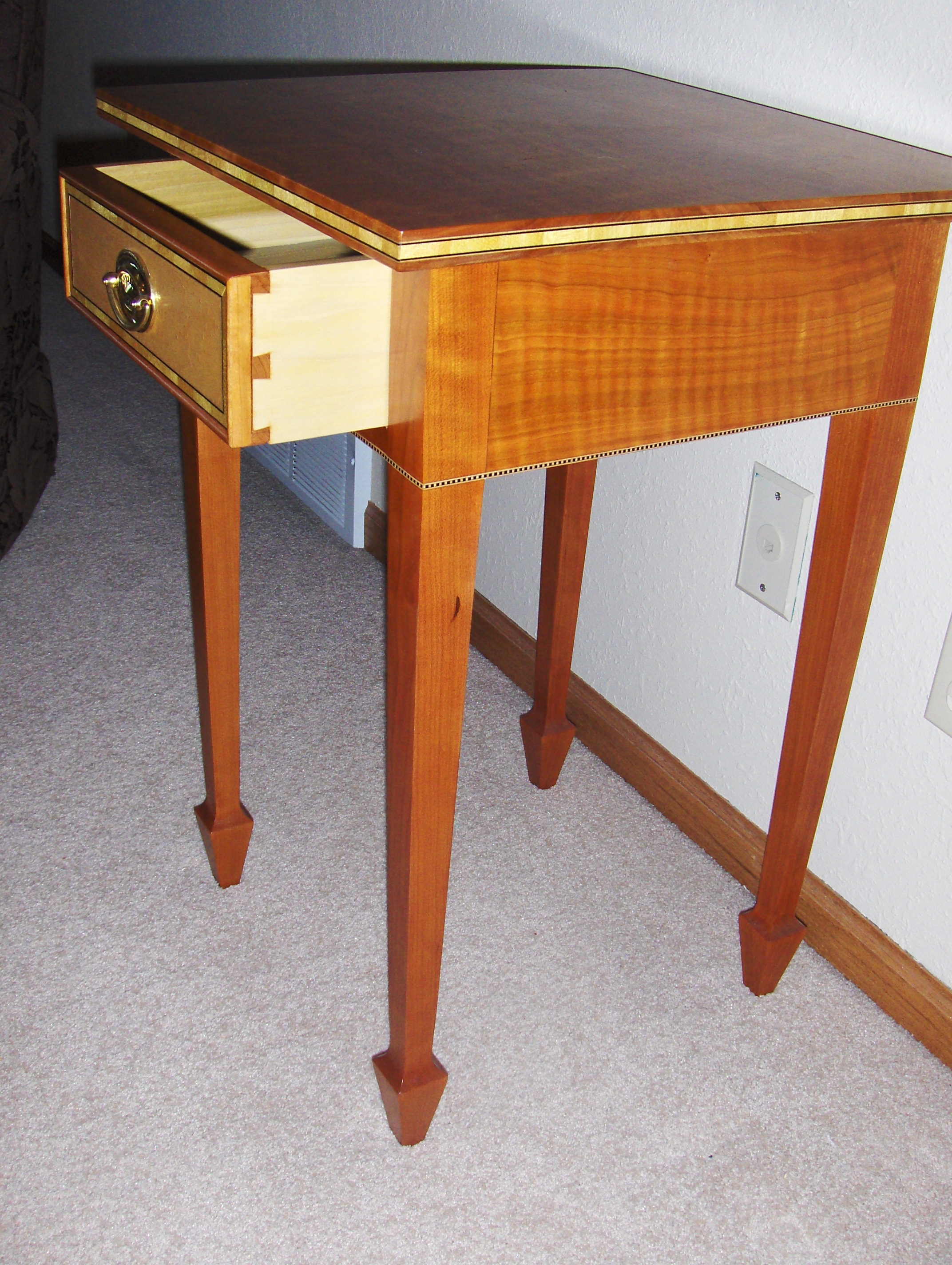 Federal style table done in curly cherry. Birdseye maple inlay on the drawer with inlay banding for accent.