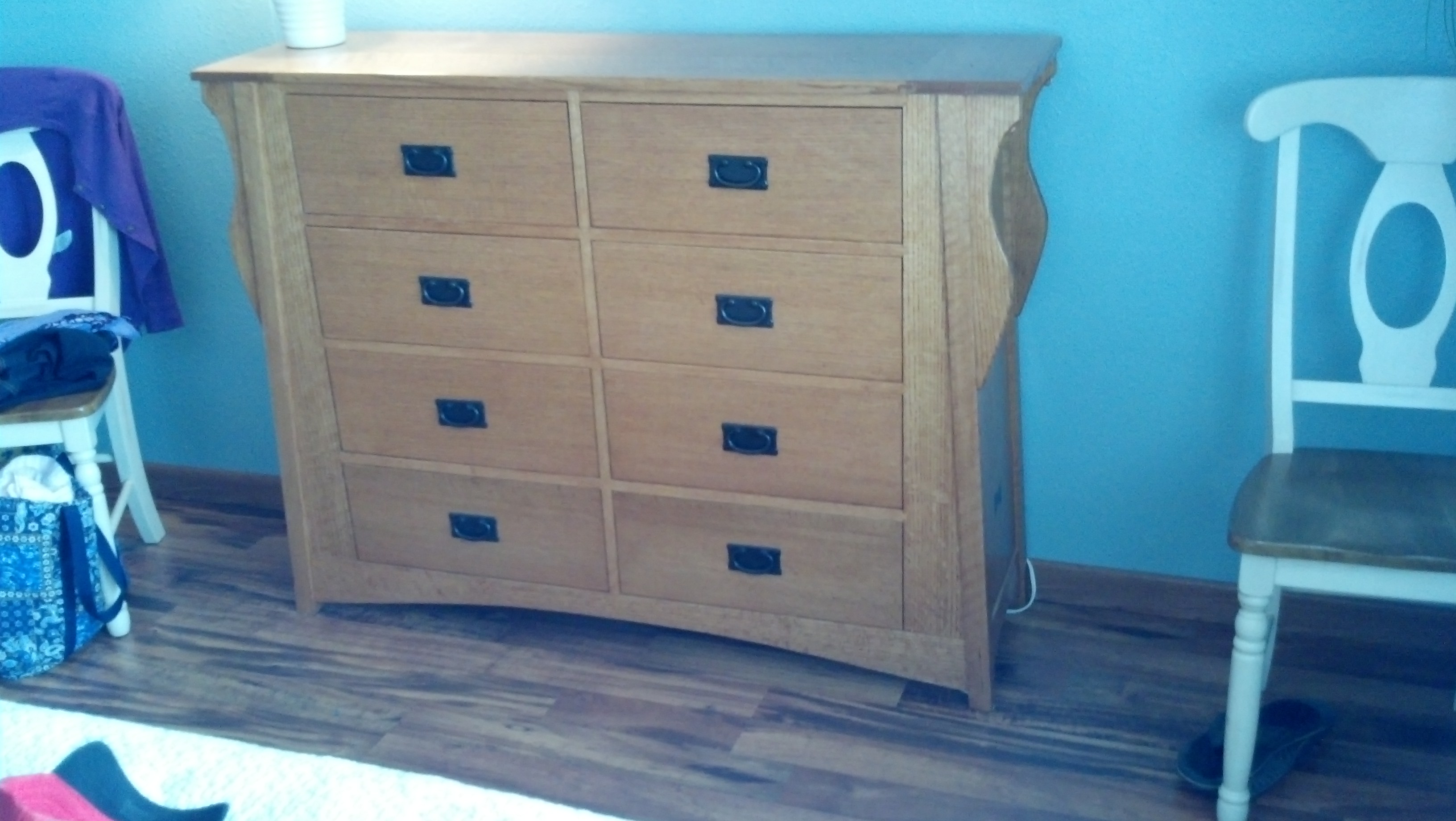 Quartersawn red oak dresser, walnut butterly inlays, breadboard top. The case is angled to give a different look to a chest of drawers.