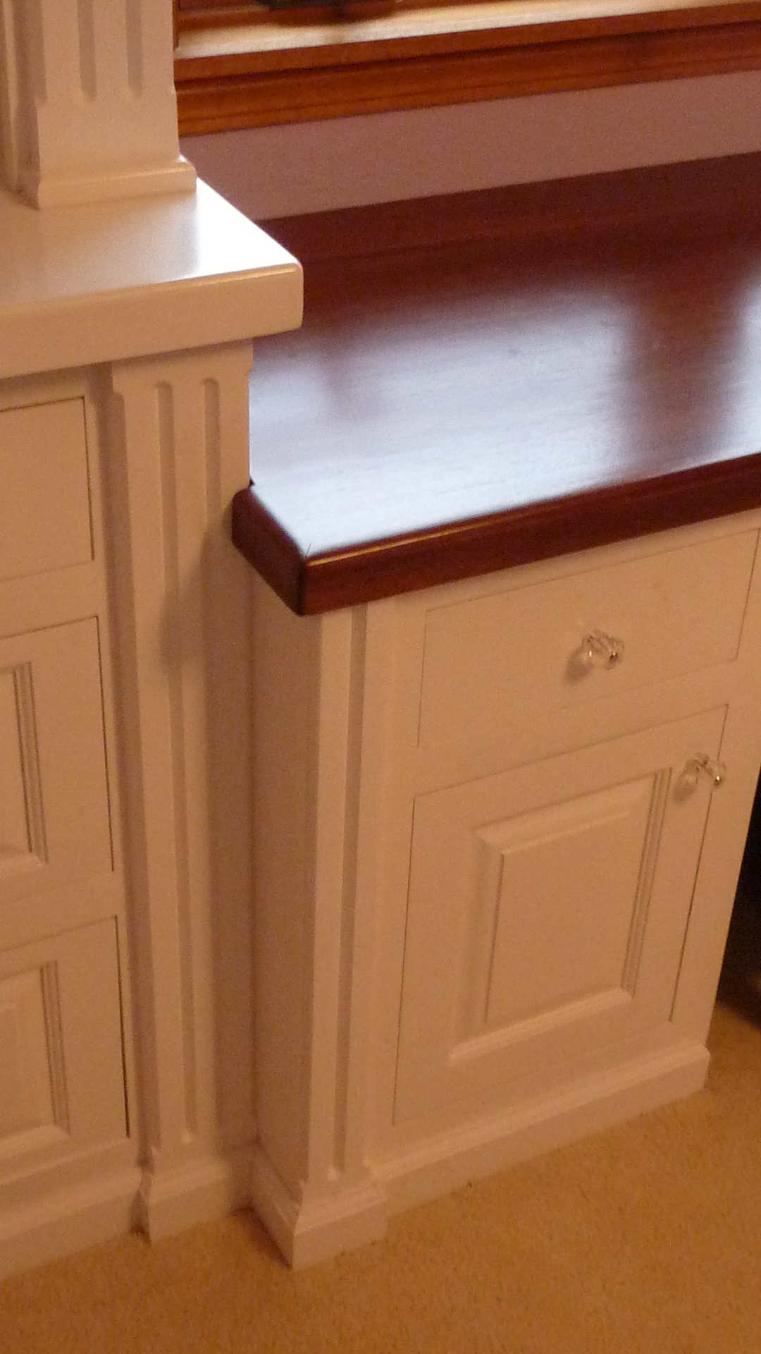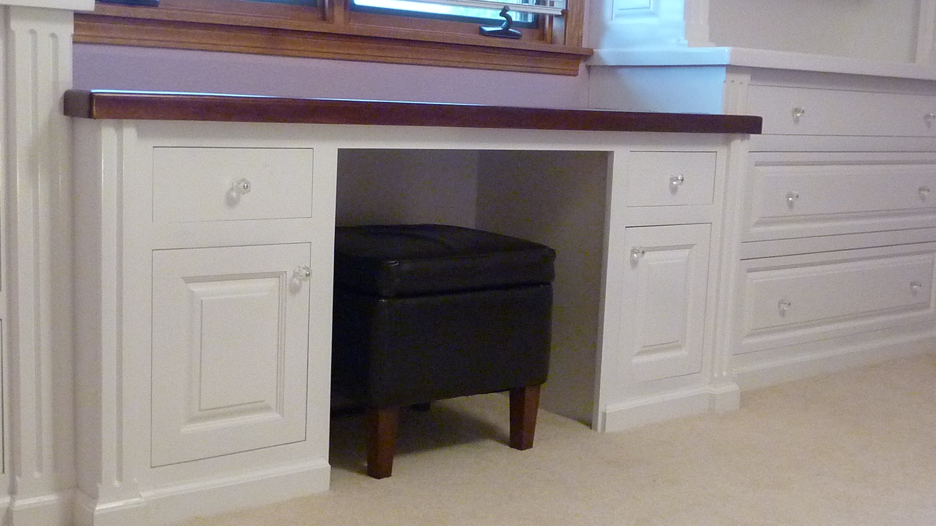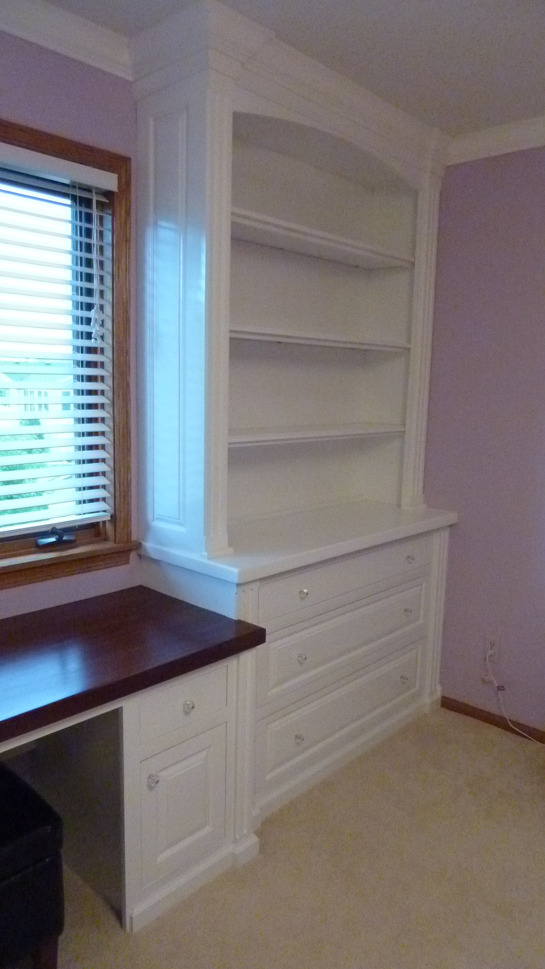 Built in wall unit I made for my daughters room, Baltic birch plywood and paint grade maple are the woods used. Mahogany for the desktop. Finish is tinted lacquer with a gloss lacquer top coat. LED lighting in the top of the case.